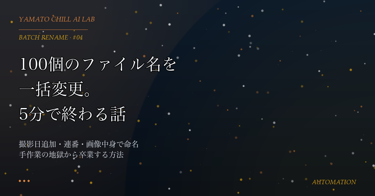 ファイル名の一括変更、手でやったことありますか?100 個とかだと、1 つずつリネームして途中で心が折れます。