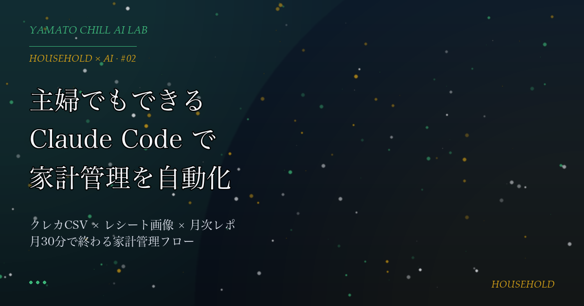 「家計簿つけてるけど集計が面倒」「レシートが山積み」「クレジットカード明細と現金支出の突き合わせがしんどい」——主婦の方から聞く家計管理のお悩み、Claude Code で 5 割くらい自動化できます